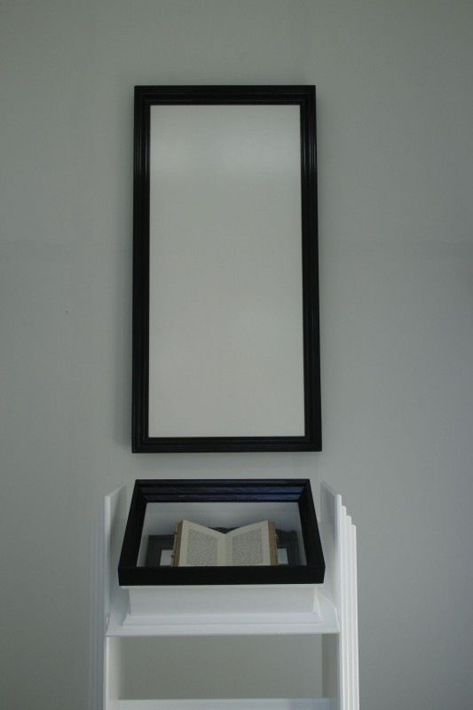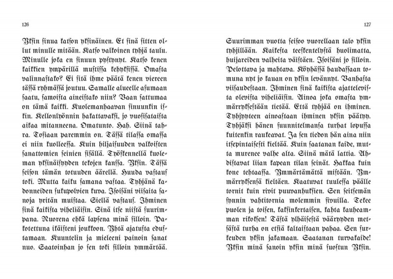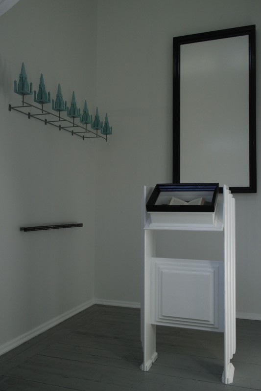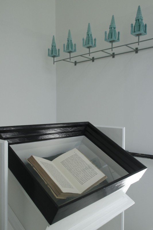 Kirjoitin tekstin, jonka tavoitteeksi otin, että siinä teos itse puhuu itselleen itsestään. Taitatin tekstin vanhalle fraktuuralle ja painatin tekstin Helsinki lithossa ja laitoin painoarkin kirjan aukeamaksi. Rakensin huoneeseen Mäntän Pekiloon lautalattian jalkalistoineen ja asetin työhuoneellani tekemät muut osat ja kirjan teksteineen tuohon huoneeseen.
