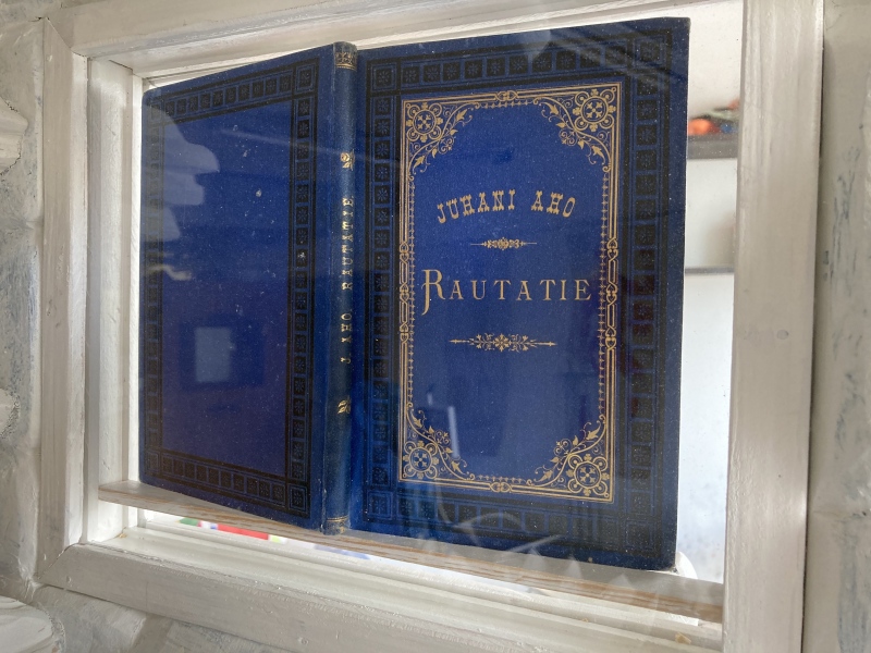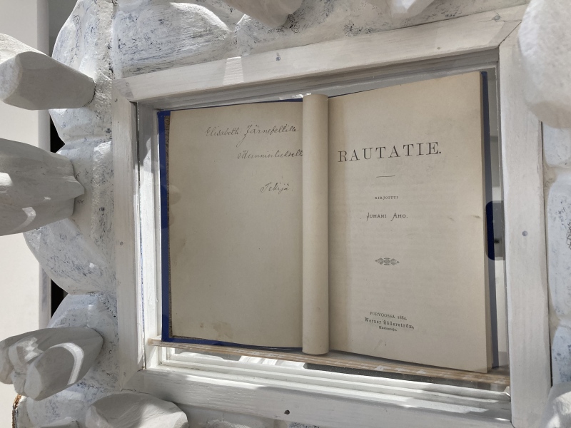 Juhani Aho (1861-1921): Rautatie, Wsoy, 1884, 1.p., korusidos, jossa tekijän omiste: "Elisabeth Järnefeltille kunnioituksella tekijä".