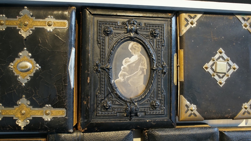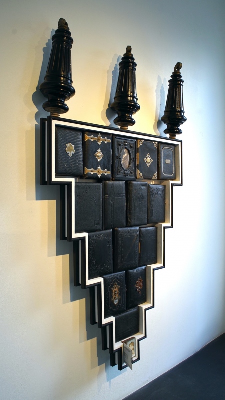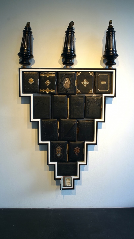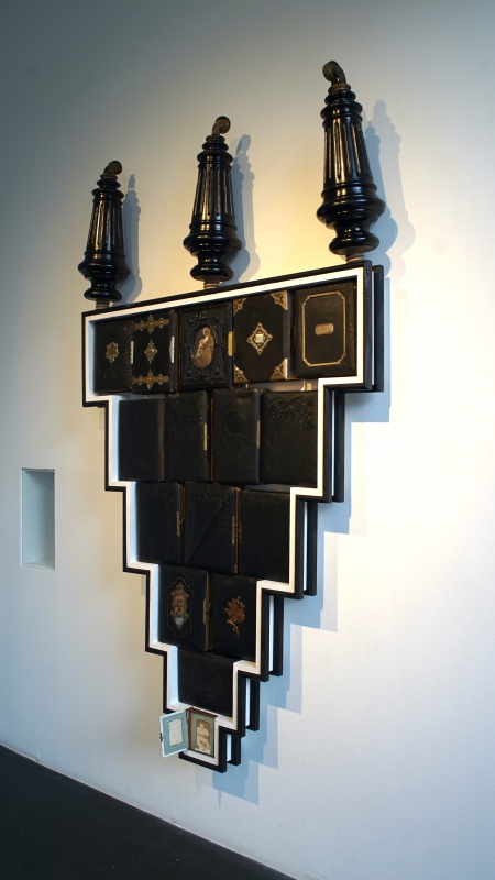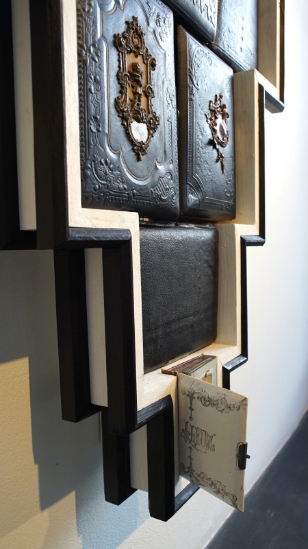 MEMORY LANE / MUISTOJEN VÄYLÄ, 2022, puu, rauta, suomalaiset vanhat valokuva-albumit. (Omistaja Sastamalan kaupunki.)