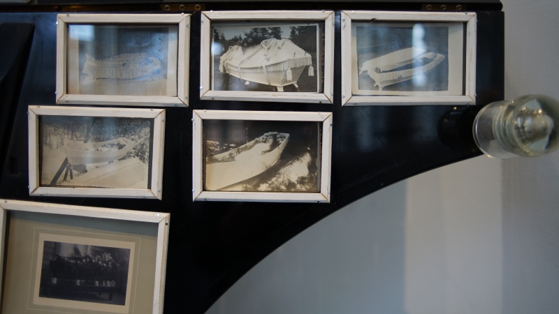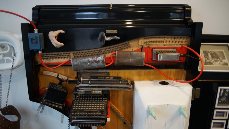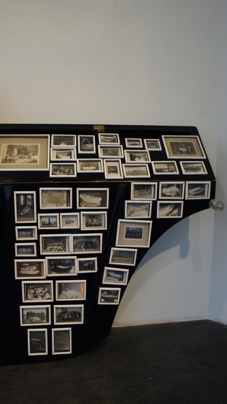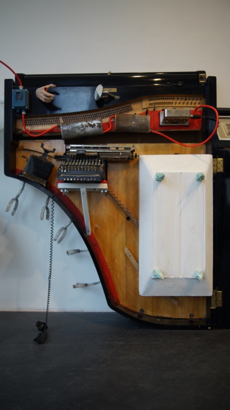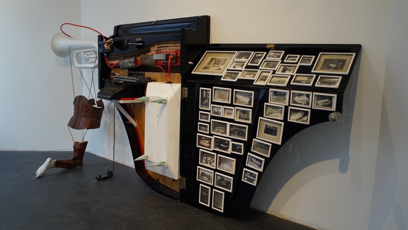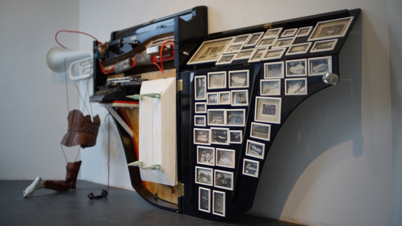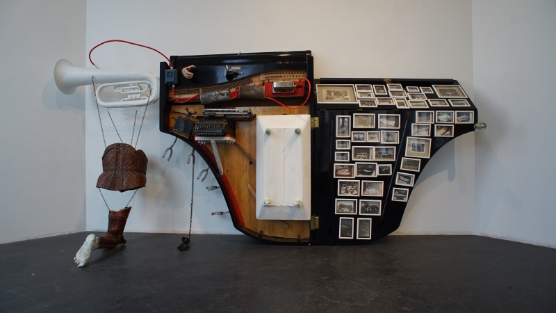 DEATH FUGUE / KUOLEMAN FUUGA, 2022, puu, rauta, lasi, valokuvat, flyygelin puu- ja metalliosat ja muut erilaiset valmisesineet. Isokokoinen tilateos/-veistos.