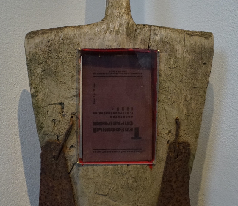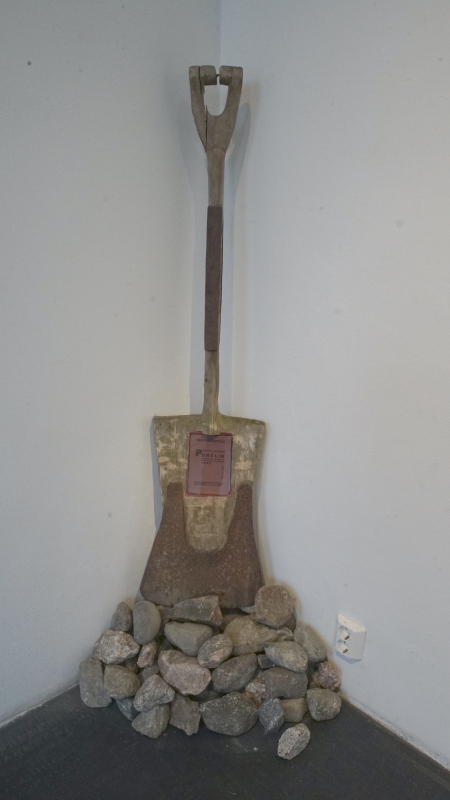 LONG-DISTANCE CALL / PITKÄNMATKANPUHELU, 2022, vanha lapio, kivet, pleksilasi, sametti ja kirja
