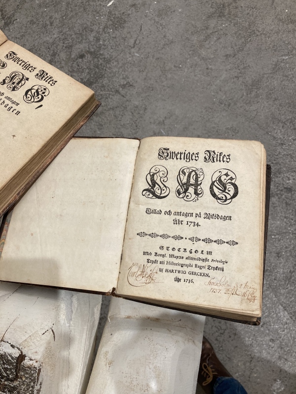 - Sweriges Rikes LAG 1734, Stockholm, tryckt af Hartwig Gercken, åhr 1736