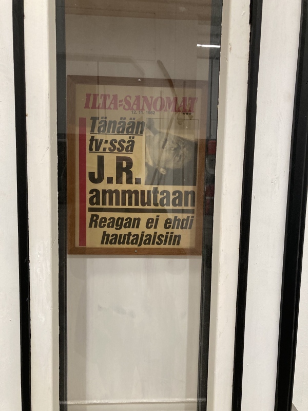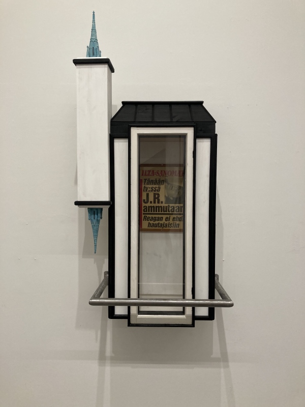 11. Our House, 2024, puu, lasi, rauta, Ilta-Sanomien lööppi 12.11.1982