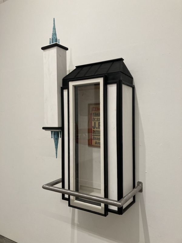 11. Our House, 2024, puu, lasi, rauta, Iltasanomien lööppi 12.11.1982