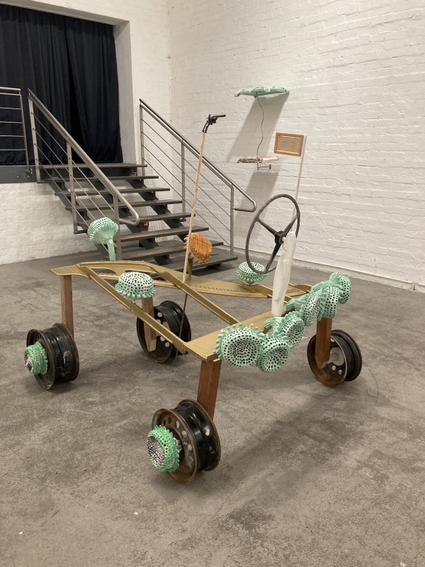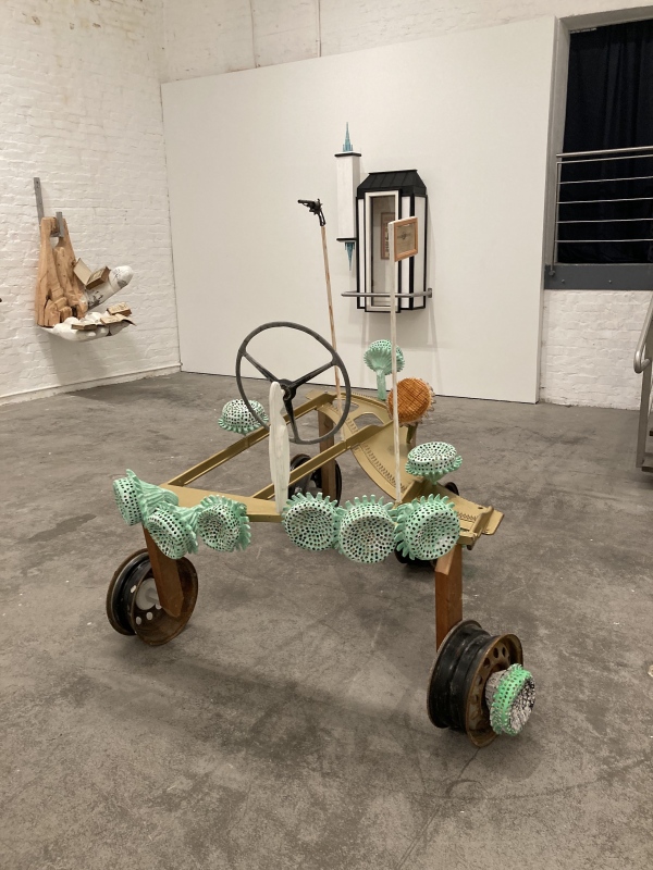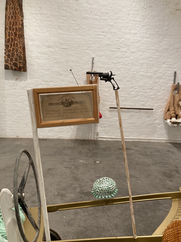 15. Ticket to ride, 2024, puu, rauta, lasi, flyygelin osa, ohjauspyörä, ase ja suomalainen taidearpajaislippu vuodelta 1866