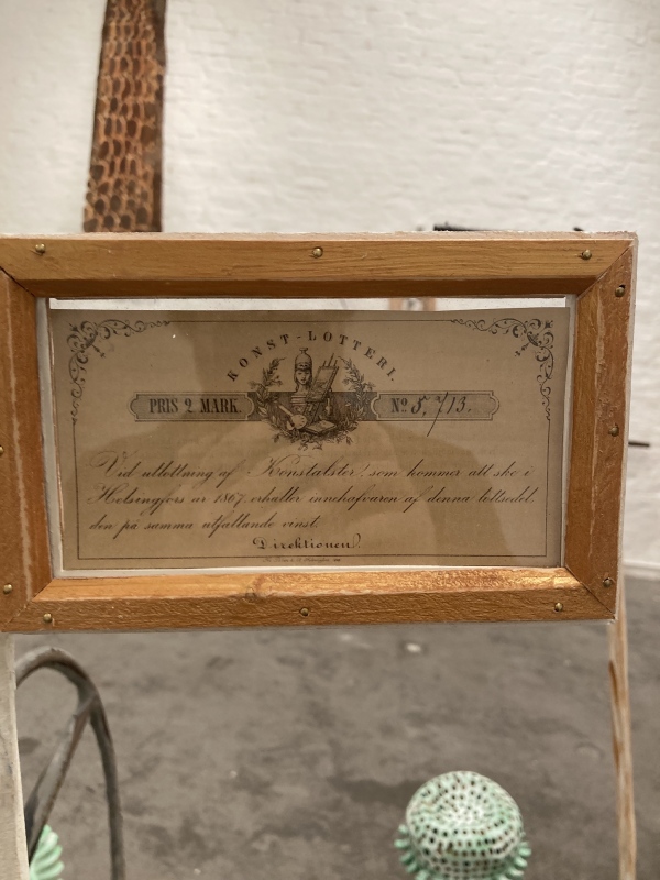 KONST-LOTTERI. PRIS 2 MARK. No. 5,713, Vid utlottning af Konstalster, som kommer att ske I Helsingfors år 1867, erhåller innehafvaren af denna lottsedel, den på samma utfallande vinst. Directionen. (Fr Polén & Co Helsingfors 1866)