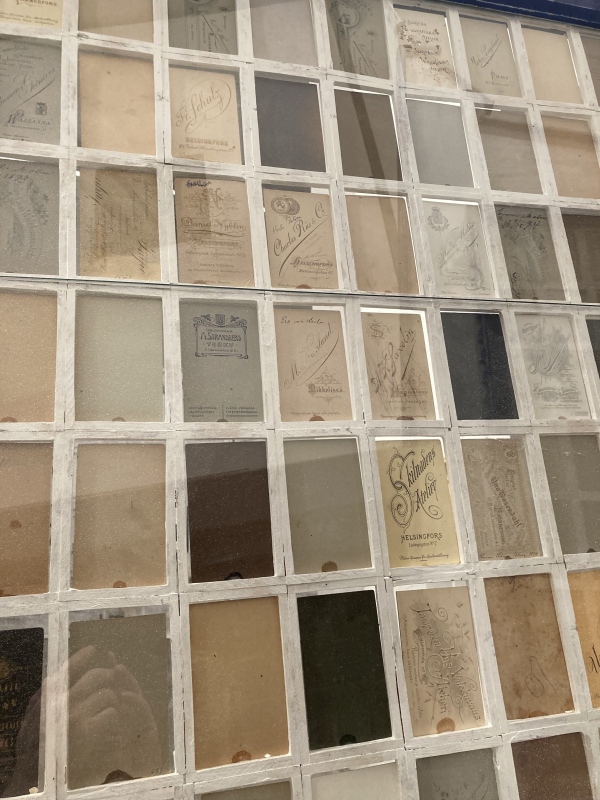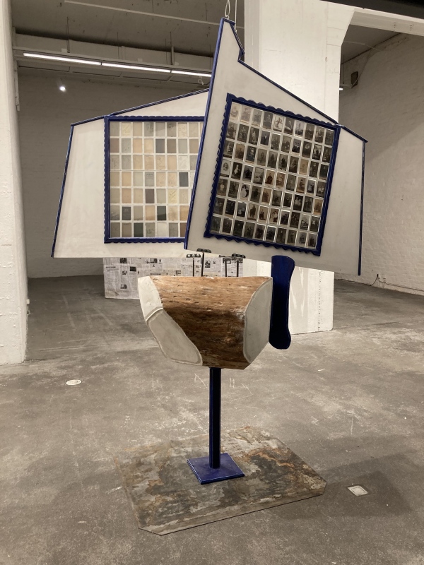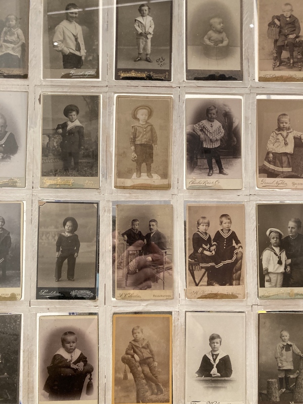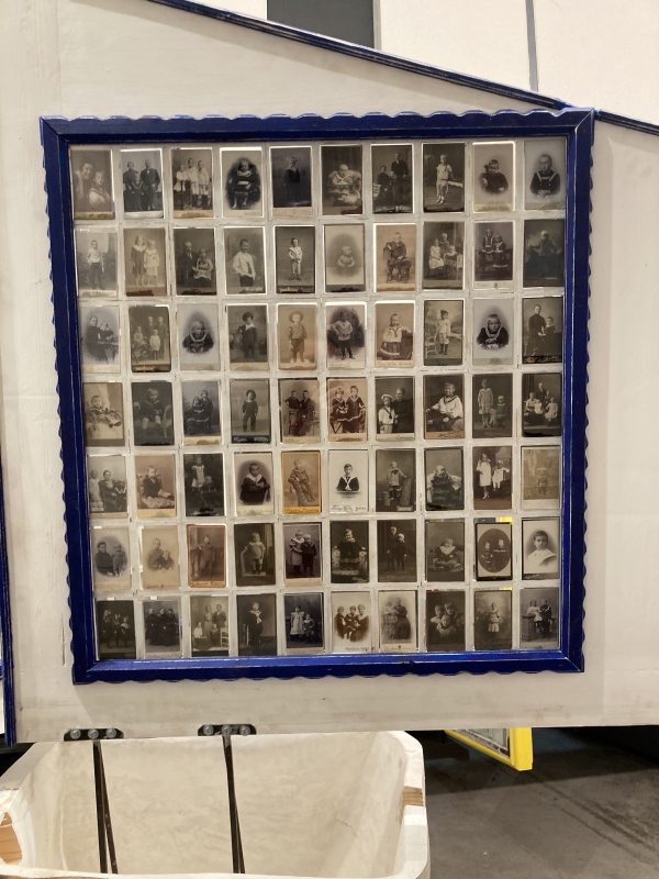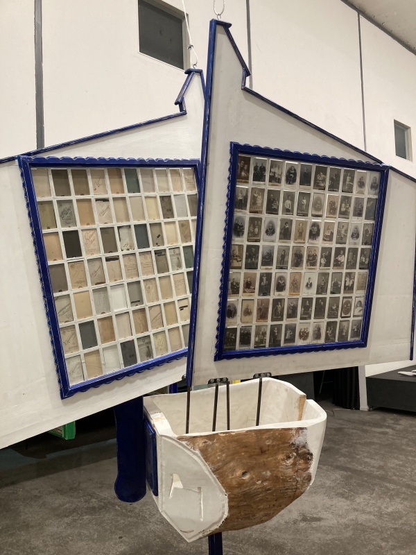 5. Sail Away, 2024, puu, rauta, lasi ja vanhat visiittikorttikuvat