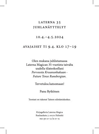 Pienellä näyttämöllä nähdään Panu Rytkösen teos Porvoosta Kruununhakaan - Future Tense Runebergian, 2024, tilateos, puu, rauta ja valmisesineet on kansallisrunoilijamme J.L. Runebergin vuoden 2024 veistoksellinen matka Laterna Magica 35 - näyttelyssä. Teos veistoksineen sisältää mielenkiintoista ja harvinaista paino- ja valokuvamateriaalia, sekä esineistöä J.L. Runebergiin liittyen.